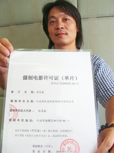 昨天,记者从章承祖出示的影单证字[2009]第454号“摄制电影许可证”上看到,影片《荷花庵》的正式批复时间为2009年6月25日,有效期两年,摄制单位名称是宁波神农戏剧影视制作有限公司。打开国家广电总局网站,记者也很快在“6月故事影片备案公示”中找到《荷花庵》的内容,具体备案号为602号。