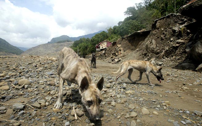 台湾高雄县小林村遭泥石流“灭村” 一片惨象。2009年8月14日,高雄甲仙山区放晴,小林村现场已经确定没有生还者,只剩下三只饿成皮包骨的狗一直闻着地面,不知是在找寻主人的下落还是在寻找食物。