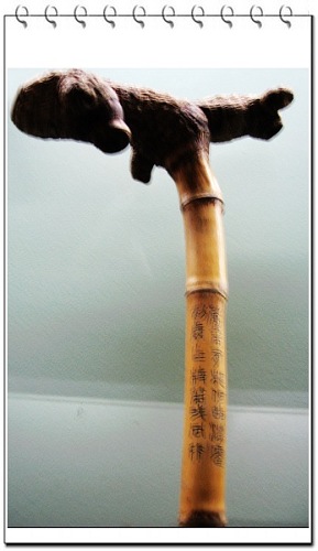 予以讽之。但是此芦显然与众不同,杆子挺直,质地坚韧,虽惨遭灾厄漂流他乡,既未“折腰”也不“变色”,尤其是根部,虬曲苍劲,皱纹密布,活象个饱经风雨,历尽沧桑的老人,尽管自已身处底层,生活的重负已压得他颈弯背驼,但他仍以干瘪的身躯默默无闻地供养着儿孙,并用瘦弱的体能奋力托起下一代,使之茁壮成材,其精神品格让我肃然起敬。人云“汉奸是中国特色”,难道伪君子也是国人“专利”?不!应该说种类与品性没有必然的关系,一定是环境和条件改变其本质。情有所动,怜亦顿生,于是带回宾馆,视同故交,翌日一早带到展馆现场,稍经构想,略作取舍、削磨,便成一杖。发自所感,遂与小罕兄凑成小诗一首: