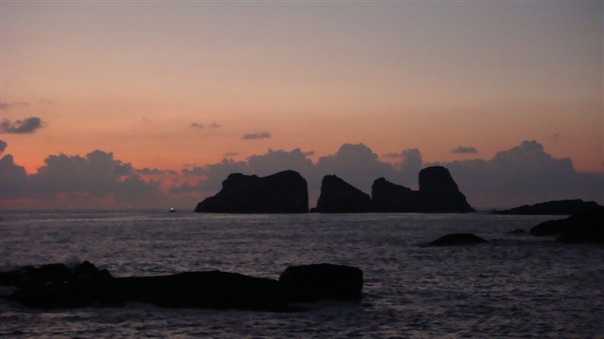 海水由远及近由三种颜色拼接而成,靛蓝,青白、浅绿,混合成一种难以名状的色块,像一朵热情盛开的大波斯菊,美得极其妖冶。这时已经可以看到由南至北11座形状各异的岛礁,岛上铺满了绿,那是一种酽得化不开的绿,一路摧枯拉朽般烧下山坡。靠近主岛东岸的就是五虎礁,有“五虎守疆”的美誉。五虎礁由伏虎礁、尖虎礁、高虎礁、平虎礁、老虎屎礁组成,五礁自成一线盘踞,沉浮于汹涌波涛之中,气势雄健。