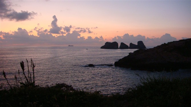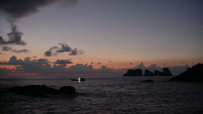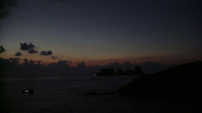夜晚,夜幕降临了,我们几个人正坐着聊天,忽然看见前面的营地上上有人放起了孔明灯,孔明灯接近天空化作“星星”,在远处海上作业的渔船都已经亮起了渔灯,连成一片。看上去严然是一个大光环,渔山的光环。