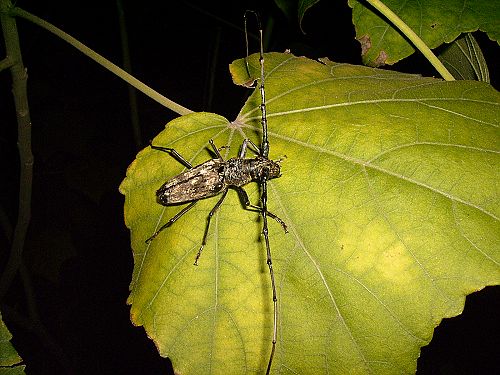 不过,我们都依然信心十足,相信前面的路上还会有更多更有趣的昆虫等待我们去发现去观察。当我们又走在草丛间的时候,不知道是谁喊了声“我看到了我看到了,这里有只长着角的昆虫... ...”等我们陆续赶到,它还依然动都不动的停留树叶上,几十个灯光将它照的透亮。当我看到它的时候,所有的记忆回到童年。多么熟悉的模样,孩提时曾将它抓来玩过的呀,却已不记得它叫什么了。只听老师说,那是云斑天牛,因背甲上的花纹犹如天上的云彩,是植物园中最大最漂亮的天牛。原来,原来它叫云斑天牛呀,在我的心里暗暗的叫着它的名字,同时,手上的相机也不停的拍下了所有的记忆。