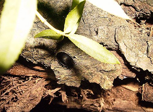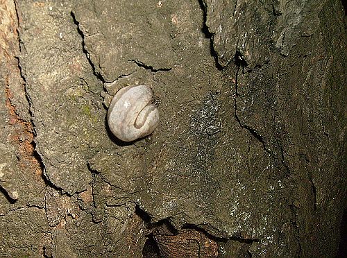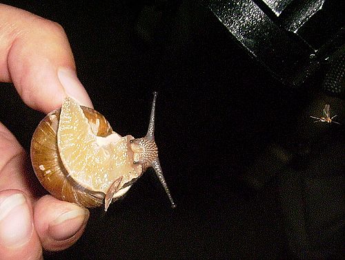 在一棵似乎有很久年代的榆树上,我们还发现了一个很有趣的画面。一只很大的泽蛙在树根旁边抬着头似乎在看着什么,当我们顺它的目光将手电筒照在树枝上的一只红色蟑螂上时,所有的疑问都一目了然了。而那红色的,红的透亮的那种蟑螂,不知道是灯光照射的缘故,还是真得长得如此透红,显然这并不是我们要去研究的,对于此刻而言,我们更好奇青蛙是否会吃了那只蟑螂?在榆树的另一边也正在发生着另一件奇妙的事。在那散发着树浆香味的树皮上爬行着好几只鼻涕虫,甚是恶心,而当老师告诉我们,其实它的学名叫蛞蝓,也就是蜗牛的一种,只是它没有外壳而已,听老师那么一解释似乎它也变得可爱起来了。在那些树浆的上面,还停留着一只很大的黄蜂,老师告诉我们可以拍照,却不要去惊动它,以免被它蛰伤。