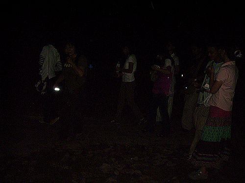 再回到大路的时候,有人在路边的一棵大树上发现了“金蝉脱壳”的奇妙景象。大家都一边欣赏着一边快速的用相机记录这难觅的一刻,一边听着老师的解说。寒蝉,体型较小,绿色,用刺状的口器刺入树皮来吸食熟汁。而此时还正在羽化的一只寒蝉,正在挣脱着最后的束缚。然而,还未等它挣脱束缚,一群似乎饿急了的小蚂蚁快速从树底爬上来直到爬满寒蝉的全身。有人说“我们把蚂蚁赶走吧”,“对,把蚂蚁赶走”有人迎合着说。也有人说“我们要保护寒蝉... ...”然而,这所有未曾付出行动的想法都被老师一一打回。老师说这就是大自然的残酷之处,大自然的法则是不允我们去改变与对抗的。所以,我们不能做什么,只能眼睁睁的看着寒蝉被一群蚂蚁吃掉。”不忍观看,那么我们也只能继续我们的夜游之行。