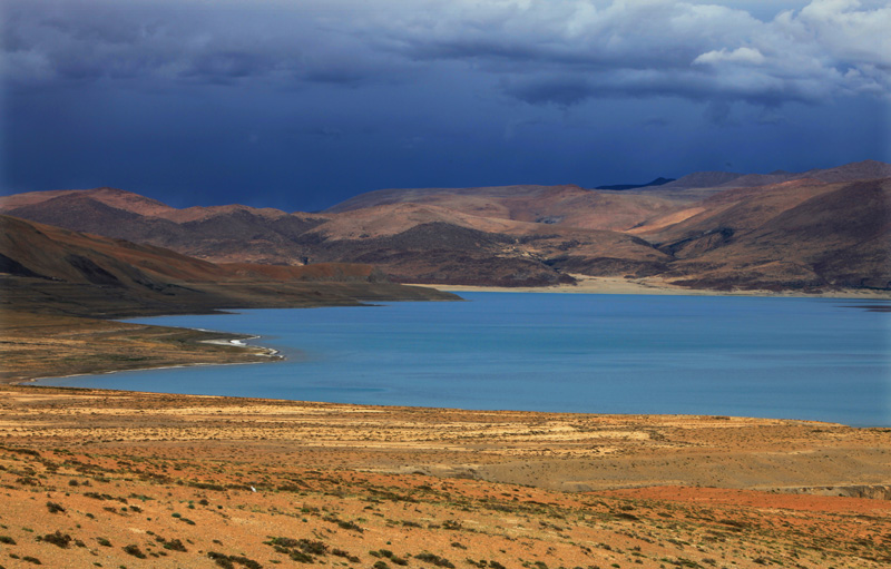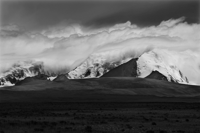 路的右边和后面是暴风雨,路的左边是西夏邦马,同是一个地点,天气截然不同。
