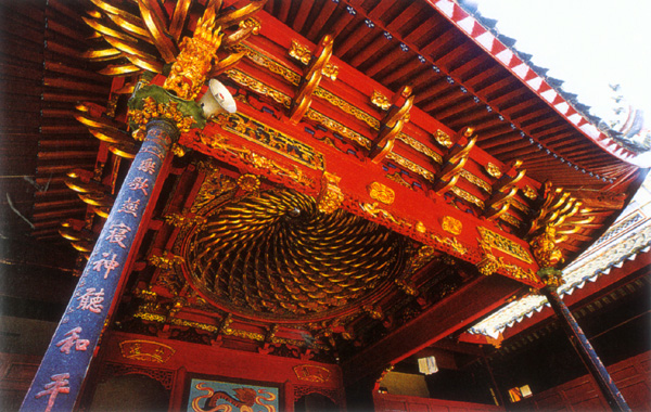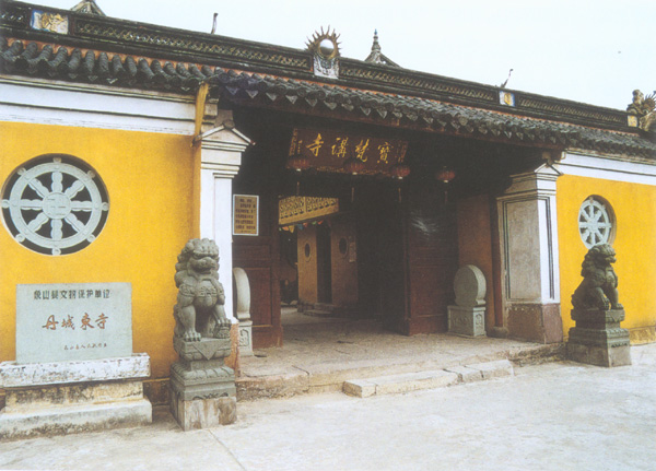 寺内圆通殿原为大雄宝殿,修建于民国时期,五开间,其中六根石柱,高大古朴,尤为醒目。一尊"千手观音",端坐莲台,金光熠熠,造型精美。高大雄伟的在雄宝殿是全新建筑,外形为传统的双层宫殿式风格,屋脊高十九米,飞檐翘角,画梁雕栋。内部更是流光溢彩,金碧辉煌,大红柱子,精可两人合抱,中间数根高达十三米。此殿建成,仅梁柱用木就耗资百万余元。内奉"三世尊",三尊大佛雕像及左、右两壁前所塑菩萨、罗汉,俱遍体金光,令满殿生辉。正如其山门对联:治平赐等慈,洪武立丛林,千载沧桑,佛光重放,宝刹于今成胜迹;翠岫呈伏象,碧溪鸣凤跃,四时烟霭,禅意更添,梵声起处涤尘心。
