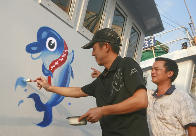 9月12日上午,石浦渔村40133 船老大万建勇正认真地在自家渔船的驾驶台边上画起了开渔节吉祥物“腾腾”。在石浦渔港,像这样画着“腾腾”吉祥物的渔船越来越多。