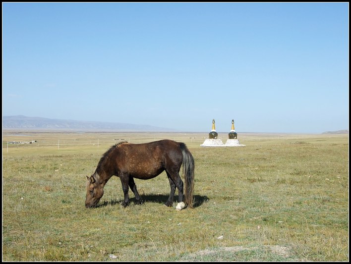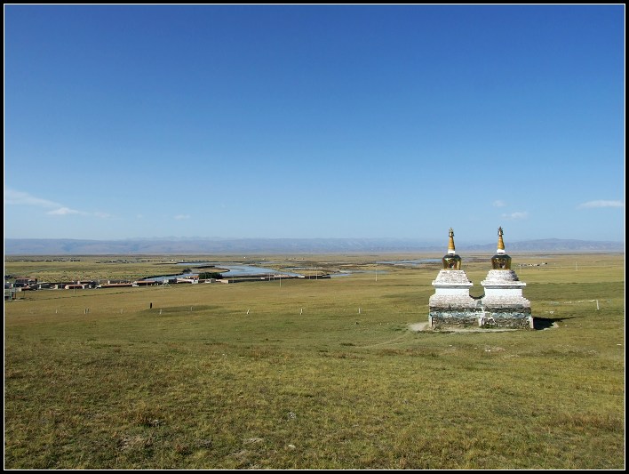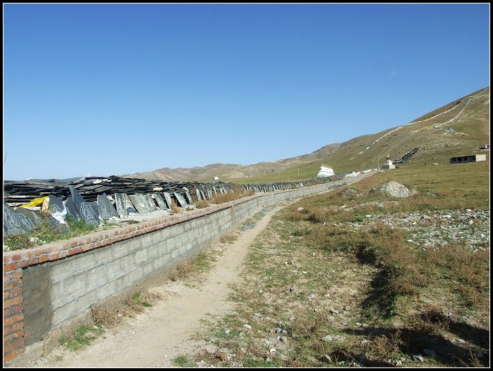 这个长廊很多文化底蕴的,小藏民今年16谁,这个长廊在他懂事前就已经建好的。这上面放着藏佛教的所有佛像和经文,都是刻在石头上的哦。我说,这么多年,不会被人拿几块去啊。他说这个是他们崇高信仰,谁都不敢拿的。绕这个长廊顺时针走上几圈忘记了,是代表着吉祥如意的。后来来了个老者,在前面朝拜了三下,就手上摇这个个会转的叫什么叫不出来,嘴巴在自念先什么东西,绕着这个长廊默默的走啊走,走啊走。其实来这里想点事情,思考点问题,还是很好很好的,心能很平静的伏在这辽阔的草原上。