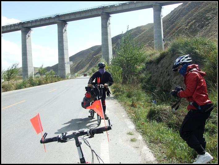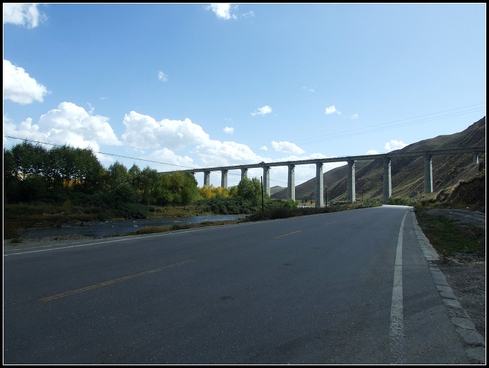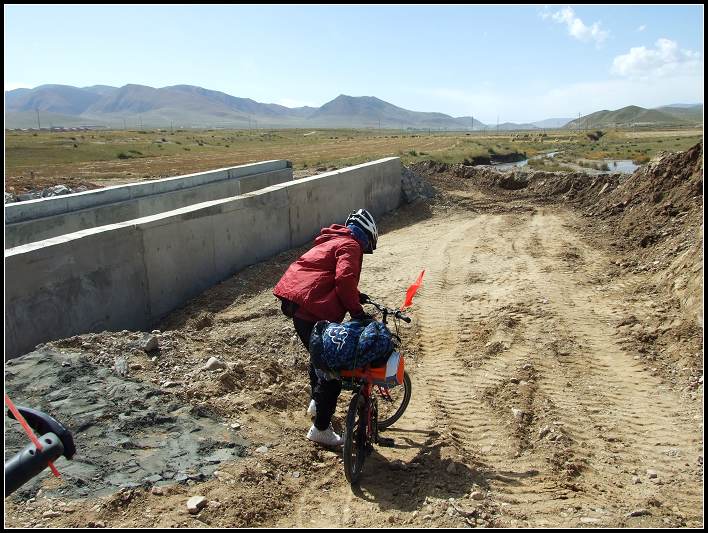 国道一段在修路,我们没走便道,径直往前行。在半路路断了,原来在造桥,我们就自己开路,从桥下穿过。