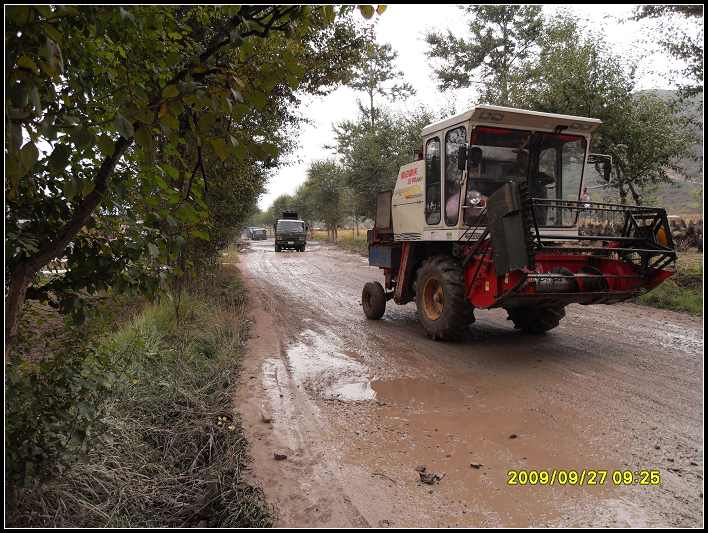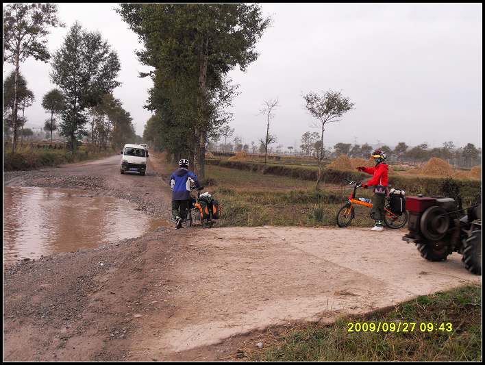 娃娃的车,整个轮组都沾了泥浆,刹车会因此而失灵。前面路况好转后找了个农家把车子给洗个。