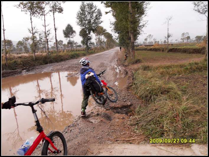 在泥泞的路上骑骑推推,一会我骑车,一会车骑我……