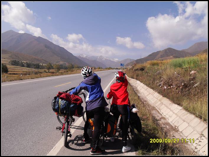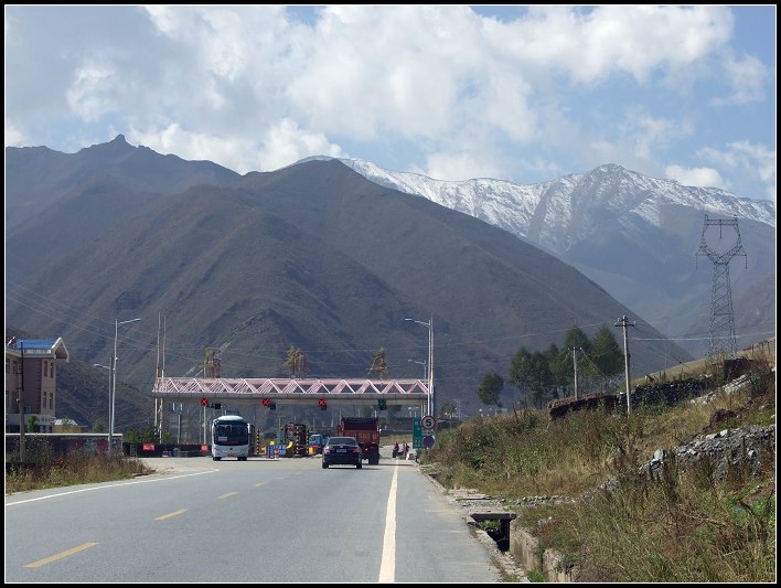 一路追逐的雪山爬啊爬,骑啊骑,过了一个大上坡后见面出现了个收费站,还以为拉鸡山就这么快翻过去了,后来才知道,其实到现在我们还没进入拉鸡山的盘山公路。我们最后是骑着车,从这么高的雪山上翻过去了,现在看看就自豪,哈哈