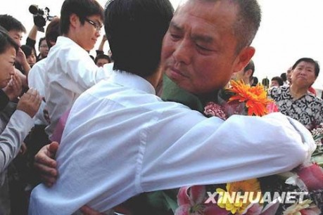 10月26日,长江大学学生与参与救助落水同学的宝塔湾冬泳队老队员拥抱以感谢他们的义举