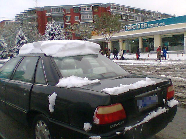 广播中说,是17厘米厚,我看,汽车上的积雪,厚厚的,怎么也得二十厘米以上,象顶着一个大雪盖。路上一哥们,盖着一顶白帽子,直冲红灯而去,,太好玩了。