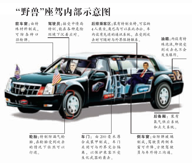 按照惯例,美国总统出国访问,不管需不需要,特工处总会在“空军一号”专机上自带一辆总统专车,以备不时之需。奥巴马此行也不例外,据美国媒体透露,特工处将奥巴马乘坐的2009款卡迪拉克加长豪华防弹轿车带在身边。