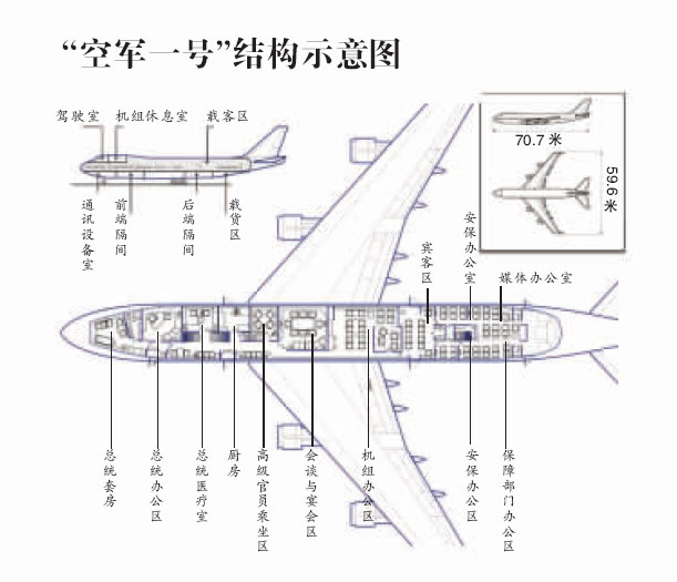 “空军一号”号称当今世界上最精密的飞行器,里面的设施可同白宫媲美。美国媒体就说,白宫里有的,“空军一号”也不缺。比如,这架飞机的空间有4000多平方米,除总统套房外,还有模仿白宫的椭圆形办公室、现代化的厨房、健身中心和医疗中心。有时候总统可能在“空军一号”接受采访,因此这架飞机还特别为总统顾问和记者等其他工作人员准备了休息室。