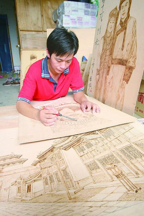 而且,因为烙铁画是利用烙铁的高温破坏木板的表面产生的焦痕来作画,因此烙铁一笔烙上去,“笔画”就再也无法修改,一开始的时候浪费了很多三夹板。