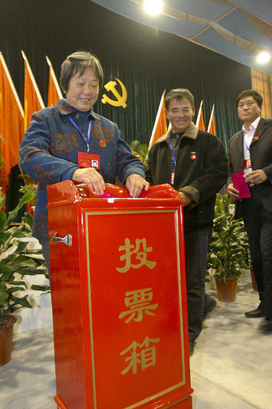 在喜庆的乐曲声中,555名党员依次从鲜红的投票箱前走过,将体现自己意愿的红色选票庄重地投入。
