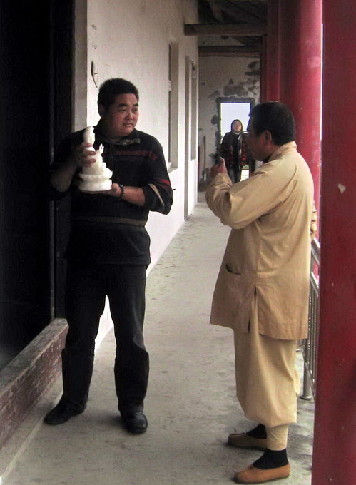 进入办公室,见到桌子上一尊精美的玉石观音像。我随手翻阅一本有关玉石知识方面的画册,先愍就说“送给你吧,这些知识我已经掌握。”我说“不能夺人之爱,拍些画册中有关渔文化的图片即可。”大家看了看他的车间,就带我上五狮山。
