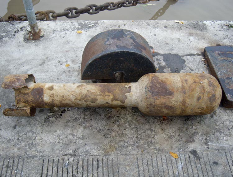 1月4日16时左右,中国水产城综治警务室民警在码头走访中获知了一件很特别的事情,当时停靠在中国水产城1号码头的一鹤浦渔船上有一枚长得很像炸弹的铁家伙,原来这是该渔船在海上作业时捕捞所得,这个铁家伙通体锈迹斑斑,长1.2米,呈大小不一的圆柱状,头部一截凸出,长40厘米、直径25厘米,中间部分长度80厘米、直径17厘米,尾部一圈又是凸出,重量达70公斤。水产城综治警务室民警将这一发现报告石浦边防派出所,派出所民警赶到现场时,渔民正打算把这个铁家伙卖给废品收购人员谭某某,边防派出所民警依法阻止了买卖,并对收缴了实物。
