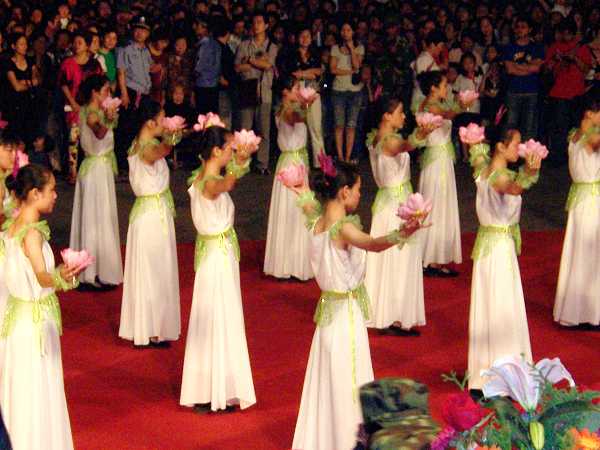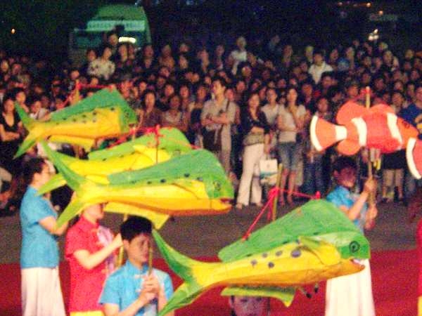 作为嘉宾,我们在礼仪小姐的引导下(图一),来到观礼台上就座.由各单位创作的鱼灯舞(图二)\荷花灯舞(图三)\船舞(图四)等,在台前作精彩的表演.