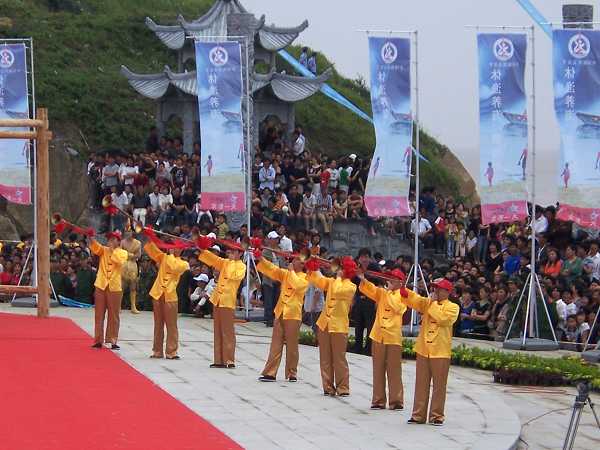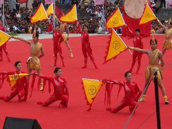 忽然,鼓号齐鸣(图三),火炮声声,挥动黄色小旗的男女飞奔广场中心,载歌载舞(图四).