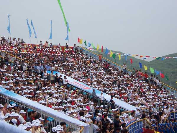 来自北京的福娃(图一),在海坛广场来回走动;观礼台上人头攒动(图二).