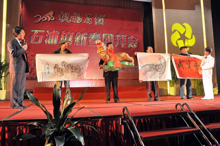 紧接着文艺演出在《春节序曲》拉开帷幕,大合唱、音乐快板、戏曲联唱等节目轮番登台,一曲由非物质文化传人陈永国等4人合作创作的《石浦走书》,部队指战员表演了《我给第二故乡拜大年》,歌颂了改革开放后特别是近年来石浦的可喜变化,结合让石浦的民间艺人上台亮相并解说船模、绣花鞋、老虎灯、鱼模以及新年关于虎的书画作品,增强了对石浦蕴藏的丰厚文化底蕴和各方民间才艺的后继有人,增强建设家园的信心和认同感和自豪感。期间特邀了浙江省内著名的男青年魔术家童章谦表演《梦幻牌王》,增强了趣味性。