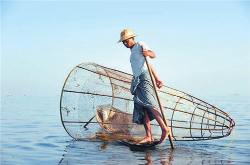茵莱湖上的渔船形状纤长,这些被称为“逐水而居的人”在船尾用一只脚站立、一只脚来操纵船桨;与划桨的脚同侧的手控制方向,另一侧的手则用来保持平衡。划船的姿态看起来一拐一拐地像跛子行走,而船可笔直前行、也可自由左转右转。