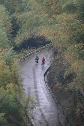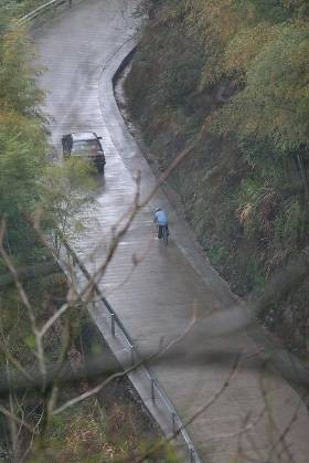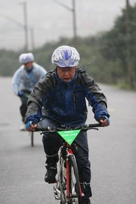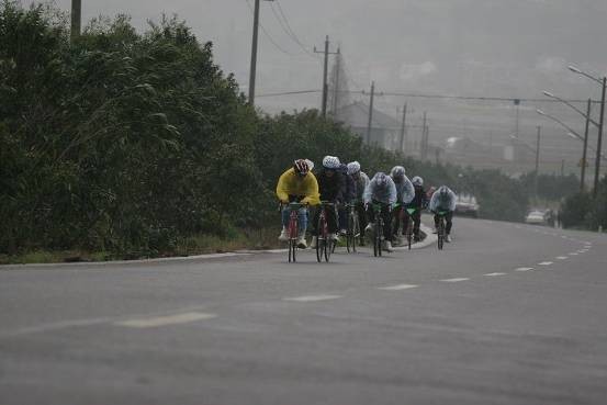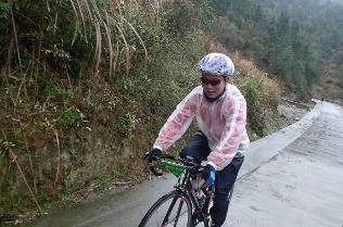 朱大哥在爬象山宁海交界处的山脉时,望着坡到不了顶,在后勤人员的游说下上了汽车,还没把屁股坐热就到了山顶。于是在最后十公里的路程中,我在一旁不停的告诉他,还有几公里,几公里的时候,他一脚一脚的往前踩踏。。。雨越来越大,他的脸涨得通红,踩下去的每一脚都牵动了全身的力气,每一脚都踩得如此沉重,就像慢镜头一样在我眼前一圈一圈的踩下去。。。