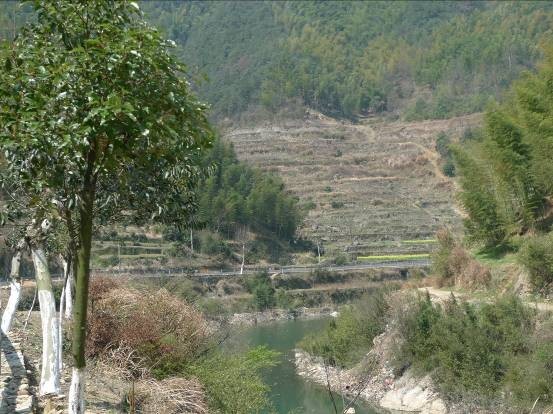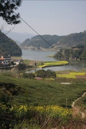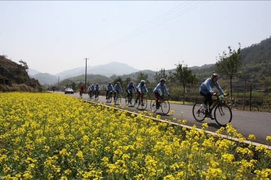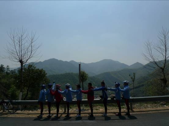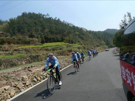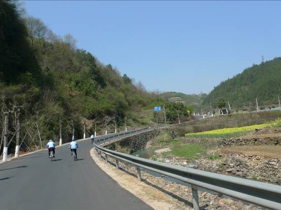 今天把大家都累坏了,从温泉酒店出来五公里便开始连续六个上坡下坡,最高海拔达到了四百八十多,走走停停,上坡热得很,下坡冻得很,爬过一座山又是一座山,盘旋而上的公路让我们时而站在山脚望上面正努力向上的车友,时而让我们站在山顶俯视S弯道走过的路。梯田式的油菜花一片一片,夹杂着绿色的田埂,修剪得整整齐齐的茶树丛,青山绿水间一幢幢白墙黛瓦老房子。一个个小村落安安静静的点缀在群山中间。