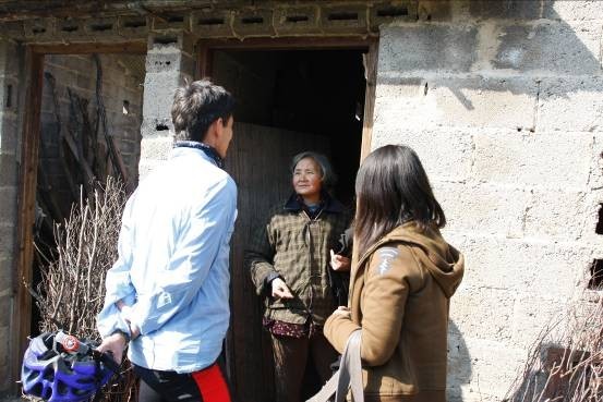 在溪水边一孤零破旧的屋子里我们风到了这位老妇。。风烛残年,一个人居住在此,很是寂寞。。。。秦进说他以后若是以后骑车经过这里定要来看看这位老婆婆。