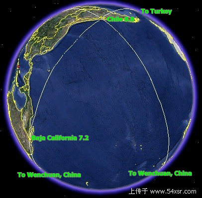 前一阵曾把汶川,高雄,智利,和土耳其的地震位置在地球上连起来,结果发现恰好是个完美的圆圈,等分地球。昨天靠近洛杉矶的墨西哥边境7.2级地震,也就有了新的研究素材。 今天把墨西哥地震位置一标出,不禁倒吸一口气。把智利,墨西哥,和汶川三点一连,又是一个完美的圆,正好又是等分地球。这两个圈,在汶川和智利相交,无可挑剔的对称。这个不安分的地球,到底想要告诉我们什么呢?
