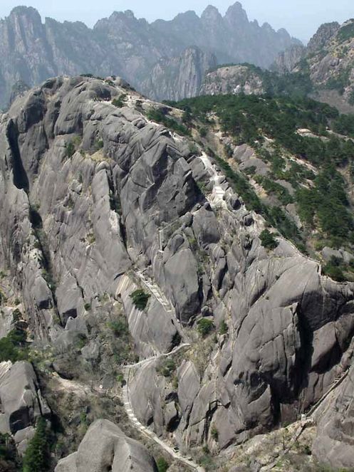 1937年,怀宁石工队历尽艰险,将此道开通,并护之以石柱铁索,从此游人攀登揽胜,甚感安全。