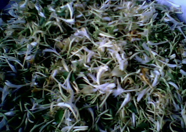 昨天早上总算见到了弱弱的阳光,去地里拔草,时不时的闻到附近山脚下飘过来一阵阵清香,好熟悉的味儿,是金银花开盛吧
