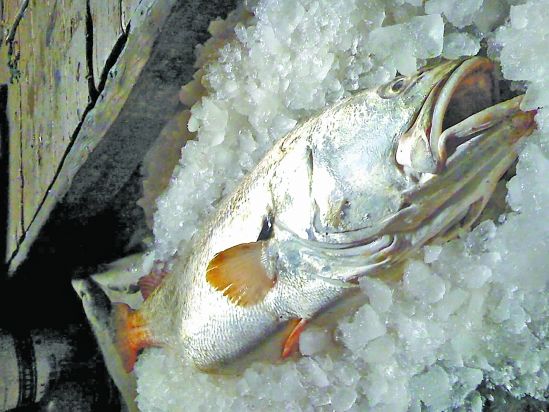 这条黄唇鱼身长1.2米、重68斤。为了保持鱼的新鲜,大家用碎冰把鱼围住,到了港口立即运去码头销售。