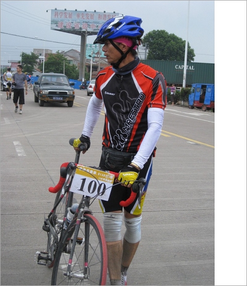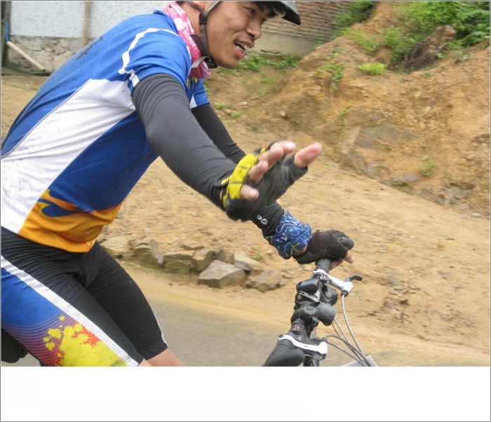 因为修路,路况高低不平,出发还没5公里,我就在此摔车了,30+码的速度摔下,我向前漫了三大步还是没能让身体停下来,还就势在地上打了滚,还好就身子左侧皮外伤。当时老杨说我的车子废了,无法参加下面比赛了,那个时候郁闷啊。可是话刚说完老杨理了车说还能骑,哈哈,天无绝人之路啊。不过这么一摔缺摔出了一系列问题……