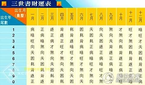 计算方法:以出生年的尾数,配合农历出生月,根据以下《三世书》的财运表对照查阅所属财运。如在立春前出生(即新历二月四日前),便算上一个年度。