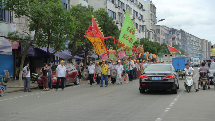五月晦夕,城隍庙老爷(姓英,明嘉靖间人,《一捧雪》、《审头刺汤》所演中人,与戚继光有关。)、戚老爷(继光)在住首们给更换新袍帽靴之后,从高高的神龛中请下来,称为“落殿”。是夕演戏达旦,某些年分前后两殿同时演戏;妇女儿童来庙“护寿”,亦通宵达明。初一上午,戚老爷坐敞轿出行各境,称“扫街”(传官是戚继光大,辈是城隍爷大,舅甥关系,故扫街的差司由戚继光担任)。扫街之目的是清道,出行路线上的遮阳雨篷、竹竿电线绳索等障碍物一概清除,以免行会仪仗受阻。清王垲《爽园吟草·石浦赛会》诗记其事:“戚爷何事太辛劳,亲向街头扫一遭。赢得一朝好口福,家家美酒与羊羔。”又女报马“时样宫妆绝世姿,娇躯无力马行迟。”剧怜常把琵琶抱,仿佛明妃出塞时。”初一至初五,庙中日夜演戏。初六午后,开始行会,从城隍庙出发,鸣锣开道,鼓乐齐鸣,爆竹与鸟铳齐发,彩旗蔽天,迎风抬展,几十对大红灯笼为前导。“千斤担”来了,由一个穿短打的小丑,挑着一副木板担,板上挂满铁链铁条,横冲直撞,意在让挤向街心的人群让开。大头公、大头婆来了,他们头戴大头套,笑容满面,打情骂俏,引人发笑。“掠响扩”来了,一手拿酒壶一路喝酒,一手拿响扩横掠,掠地有声,其意亦在驱赶人群。黑白无常来了,黑无常矮,头大如谷箩,纸钱当头发,手持勾魂牌,来回奔跑,很费力气,人称矮伯伯。白无常,有了人高,戴高帽,帽上有“一见生财”四字,人称“周公公”,亦纸钱为发,口吐红长舌头,白衣白帽,脚穿草鞋,胸前斜披和尚饼一串,两手横来横去,慢条斯理地前进。后面跟着两批人:一批是周公公的干儿子,打扮同白无常,身披红绸一条,只是没有伸舌头,他们或骑在大人肩上、或背着、或骑马,约二三十人,想以此求得平安,不为勾魂。另一批是披枷带锁,身穿囚服的“男犯人”,这些人可能做过亏心事。在一片细乐声中,在两对手提香炉引导下,戚老爷坐着八抬大轿来了,轿后一顶“万民伞”。接着是杂耍,有抛瓷瓶、打飞叉、肩顶毛竹旗、踏高跷等。抬阁来了,由东来、南薰、西成、北平四镇(即四境)比赛而作,所谓“赛会”即此。每一乘抬阁都有一个家喻户晓的故事,有水漫金山、打渔杀家、桃园结义、空城计、西游记、盗仙草等,皆由儿童扮演。每乘抬阁扮演者5名。龙舟凤舟过来后,城隍老爷的四副执事牌过来了,女报马骑马来了,城隍老爷八抬大轿过来了。在两旁的观众纷纷向轿靠拢,手扶轿杠,以粘神气,没有摸着的双手合十,顶礼膜拜。最后来的是泥水帮的判官,小船帮的神将,皂隶刀斧手,打铁帮的文武百官,应有尽有。
