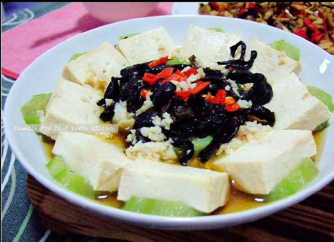 做法:豆腐、丝瓜切块摆盘,撒上蒜末、盐,牛肝菌带油一并淋在豆腐上,最后浇上蒸鱼豉油,上锅蒸15分钟就可以啦.我主要是为了打发掉油牛肝菌,没有牛肝菌也可以这么蒸,可以放点干贝或者XO酱什么的,是在不行用油蒜蓉蒸也很好吃的.