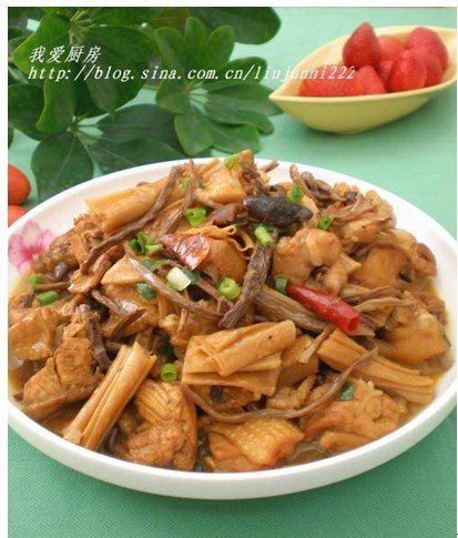 做法:1.腐竹洗净用冷水稍稍泡软,捞出将水分挤干切成约3厘米长的段;鸡肉洗净斩件;茶树菇剪去有泥沙的根部不要,用冷水冲洗干净,剪成约5厘米长的段,再用开水浸泡15分钟左右;姜切片,葱切花,干辣椒洗净剪成两截,去籽;