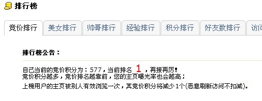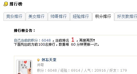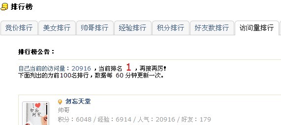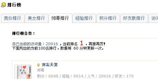 祝贺自己在象山同乡网空间(社区)里,得到所有 属于我的权限以内的所有第一名(访问量排行第一,帅哥排行第一,积分排行第一,好友数排行第一,经验排行第一,竞价排行第一,除了美女排行不属于我以外的所有第一),这虽然不是什么可喜可贺的事,但我最终经过我不懈的努力下坐到第一的位置,目前是没有人可超越我的分的,因为我一直在努力,一直很用功的给自己加分鼓励!
