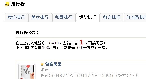 经过2009年12月10日,到现在的2010年7月23日(中间有些日子停顿)!在这些时间里,经过我不停的发帖,发图片,留言,浏览他人空间·······等等一些可以加分的地方,我终于超越所有同乡网的朋友,成功登顶,在所有属于我的权限以内的所有第一名·····