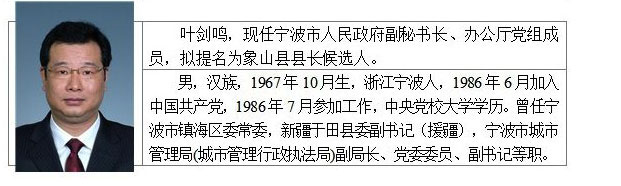 叶剑鸣,男,汉族,1967年10月生,浙江宁波人,1986年6月加入中国共产党,1986年7月参加工作,中央党校大学学历。