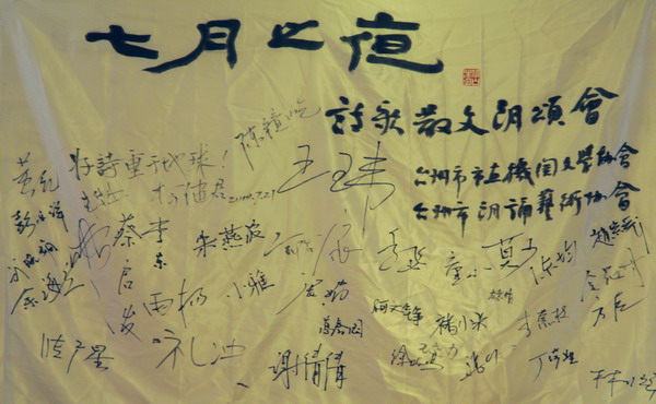 今晚,他们在这里看见一个个表达出真情的文字,他们的眼睛是有价值的。今晚,他们在这里聆听朗诵者倾情朗诵的诗歌,他们的耳朵是有价值的。今晚,他们触摸着一篇篇充满灵性的散文,他们的心灵是有价值的。来自台州交通广播电台、台州市朗诵艺术协会的十余位朗诵者为现场数60余名听众朗诵了市直机关文学协会会员的18首(篇)诗歌与散文,奉上了一台典雅浪漫,异彩纷呈的朗诵会。音乐,诗歌交相辉映,朗诵者的银亮音色令听众们再一次领略到文学非凡的魅力。为了把“七月之夜·诗歌散文朗诵会”办的别具一格,并留下一点值得记忆和回味的东西。文学协会想到了要留下与会者的笔迹,准备了签名册。但一般的签名册又过于普通,过于平淡。于是他们想到了自制签名册——用一块长长的绸布,请市作协副主席、《台州文学》主编、书法家金岳清题写了“七月之夜·诗歌散文朗诵会”,并盖上了红红的印章。