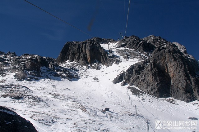 雪山脚下的下部站,是雪山大索道的起点站,一片茂密的原始森林,这里海拔3356米,索道由此往上运行,直至雪山主峰扇子陡正下方的上部站,那里海拔4506米。索道全长2914米,垂直高差1150米。是我国海拔最高的旅游客运索道。
