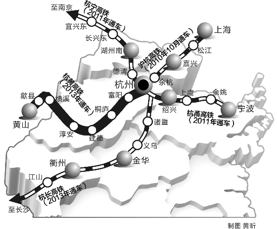 杭长高铁浙江段全长295.185公里,浙江境内沿途设萧山、诸暨、义乌、金华西、龙游、衢州、江山7个站,设计时速350公里左右。工程于2009年12月开工,计划2013年建成通车。建成后,从杭州坐火车去长沙由目前的6.3小时缩短到3小时。