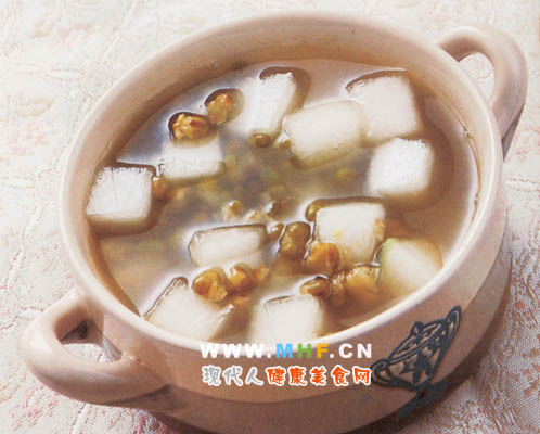 1.冬瓜去皮,去瓤,洗净,切成3厘米见方的块;绿豆淘洗干净,备用。