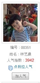 林艺晨小朋友在参加易乐益小模特比赛(  http://www.ylytoys.com/Template/Main/TouPiao.aspx),希望你帮我投上一票,谢谢^-^还有一天结束了,大家的举手之劳,让小盆友进前十吧。灰常感谢!
