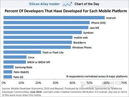 相对开放的Android,似乎起到Windows操作系统在Mac中的作用。我们已经看到Android手机覆盖了所有市场部门--从最高端到最低 端。这些产品或有或无键盘、安装了AMOLED屏幕、大屏幕、小屏幕...似乎Android手机符合各种口味的选择都有,只是尺寸的大小不同。在短短一 年时间里,Android智能手机的市场份额从1.8%跃升到17.2%,而苹果的iPhone只从13%增长到14.2%。此外Android在最重要的美国市场上是激活最多的手机,虽然苹果推出了iPhone 4。